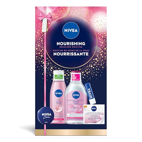 Подхранваща рутинна грижа за кожата на Nivea Подарете подарък на типичен комфорт с изпитаните и най-важните неща на Nivea: тоник за лице, мицеларна вода, крем и еликсир за устни за мека, подхранена кожа през целия сезон. $19,97 на Amazon