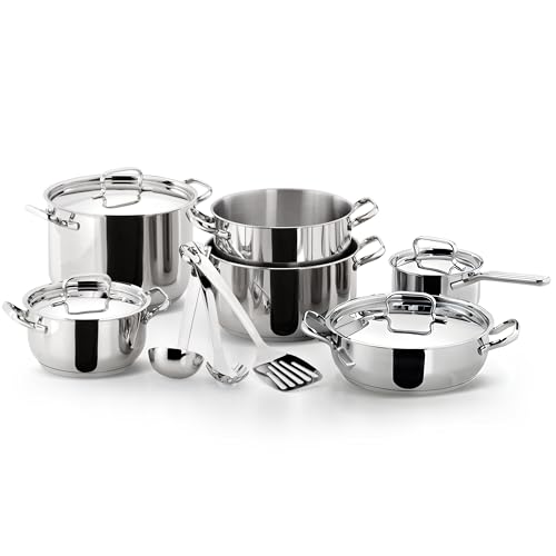 13pc Cookware Set This 13-piece set, made from durable 18/10 stainless steel with a three-layer Lagoseal Плюс основата, подобаваща за индукция, включва саксии и тенджери с необятни заварени дръжки и съвпадащи капаци, плюс черпак, лъжичка и сървър на спагети, всички безвредни за съдомиялни машини и проектирани за несъмнено захващане и хигиенична приложимост. Щатски долар 239,99 на Amazon