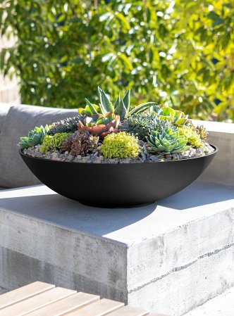 Lane уголемена кашпа 24-инчов отвор Независимо дали имате място за цяла градина или задоволително място за кашпи, тази необятна и ниска кашпи от черна смола е привлекателна и предлага обилие от благоприятни условия за засаждане, в случай че желаете да станете изобретателни. $70 в Simons