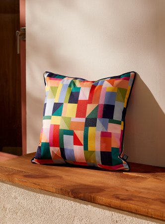 Възглавница за намерено с многоцветна геометрия Изберете пъстър геометричен принт, с цел да подобрите образната прелест на вашите едноцветни мебели за двор. Тези хубавици не са просто красиви лица; те също са направени от 100% рециклирани пластмасови бутилки за вода. $25 в Simons