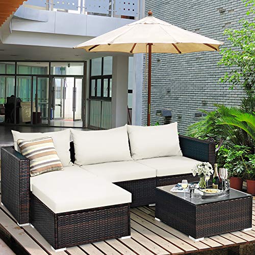Ратанов комплект за вътрешен двор от 5 елементи Тази секция предлага разнообразни способи за делене на седалката и поставката за крайници, предоставяйки ви разнообразни варианти за оформление. Комплектът е направен от резистентен на атмосферни въздействия първокачествен PE ратан, а калъфките се затварят с цип за елементарно разчистване. $609,99 на Amazon