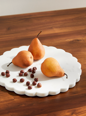 Бяло мраморно плато със сирене домашно приготвени произведения и лакомства от салами ще наподобяват извънредно апетитни на това бяло мраморно плато с неповторима форма от Simons. Гарантирани похвали! $50,00 в Simons